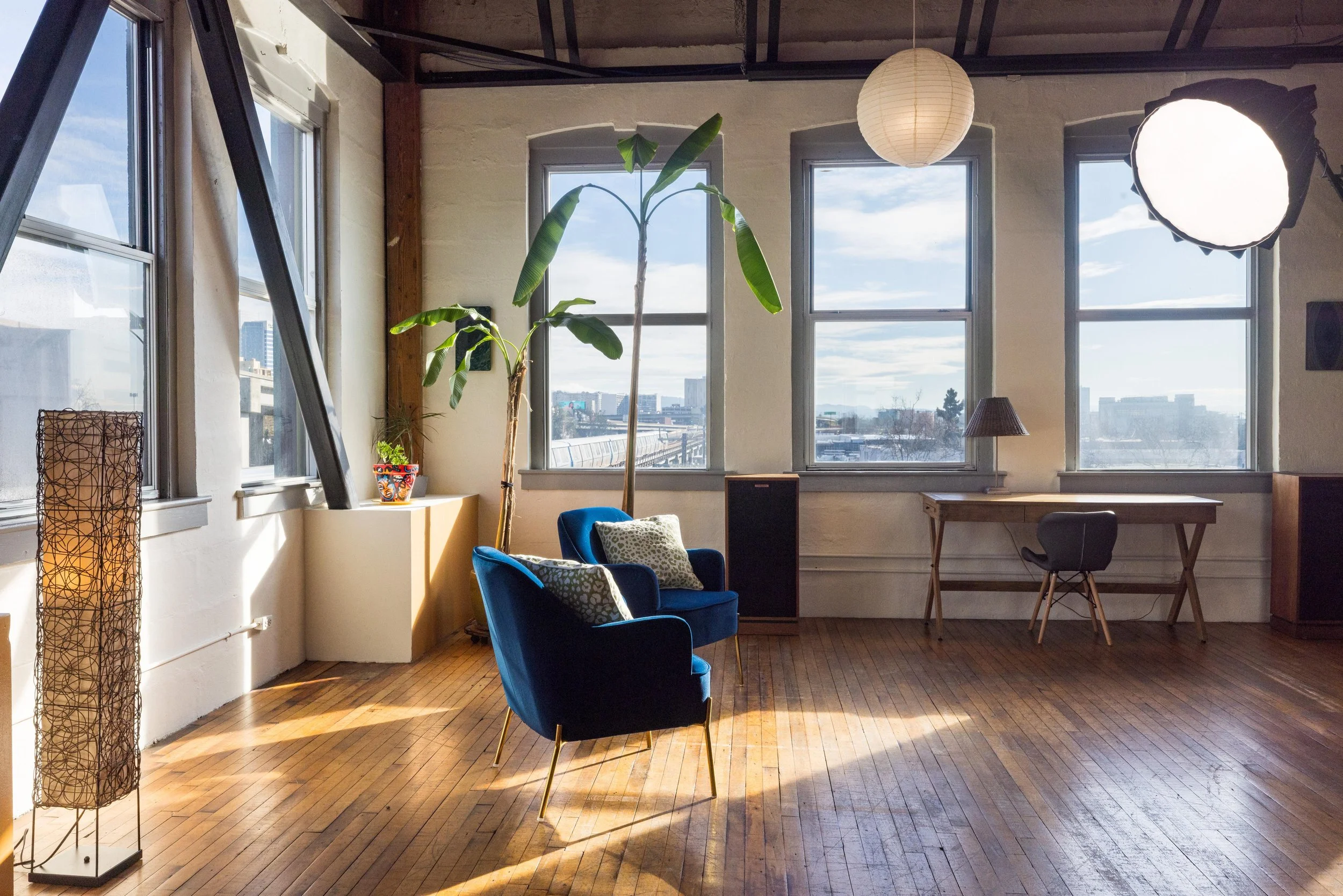 1,500 square feet of broadcast-ready production space in Oakland's industrial district. Top-floor corner loft-style studio with natural light, professional equipment, and spectacular views.
